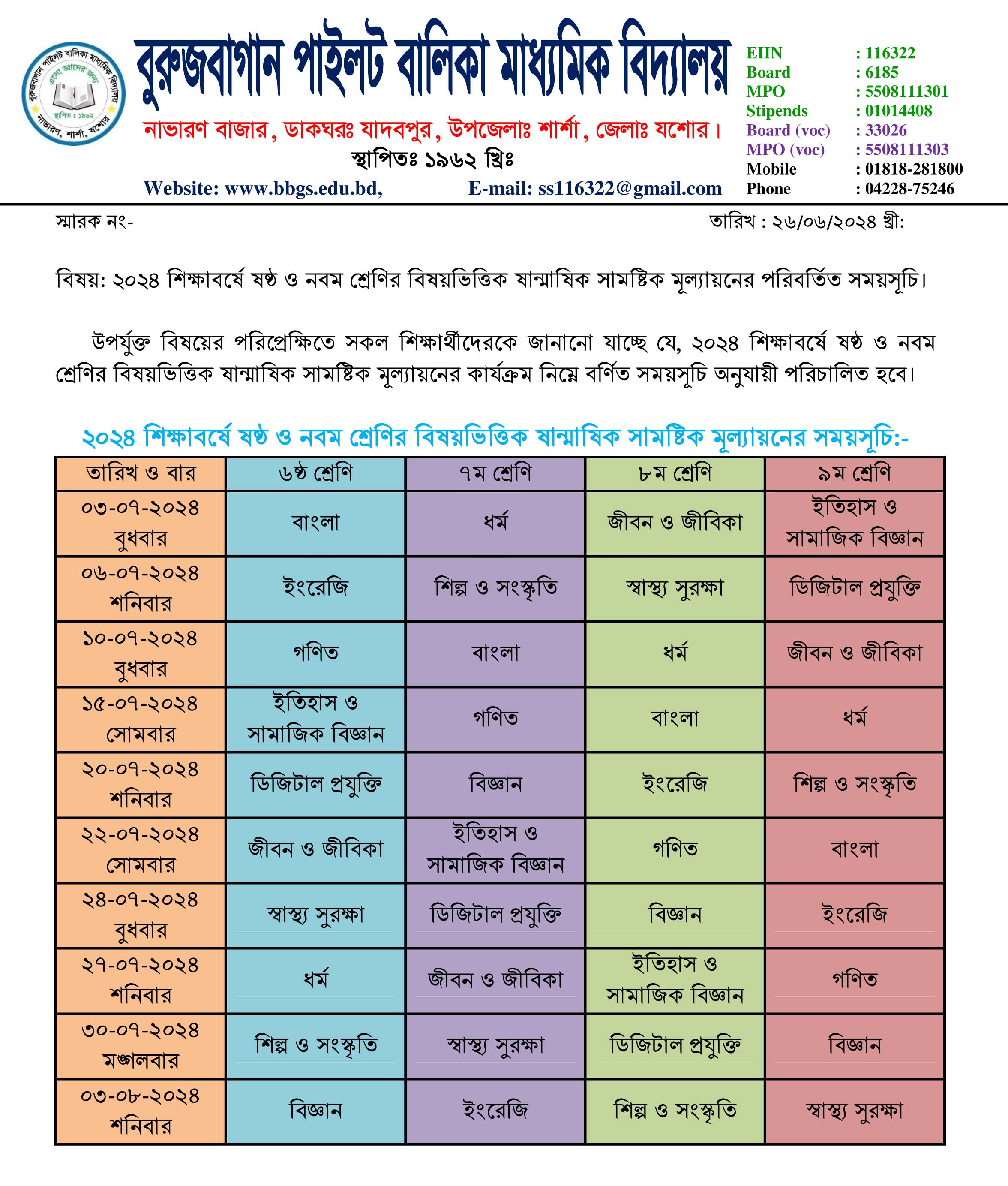 ২০২৪ শিক্ষাবর্ষের ষষ্ঠ থেকে নবম শ্রেণির বিষয়ভিত্তিক ষান্মাসিক সামষ্টিক মূল্যায়ন সময়সূচি |