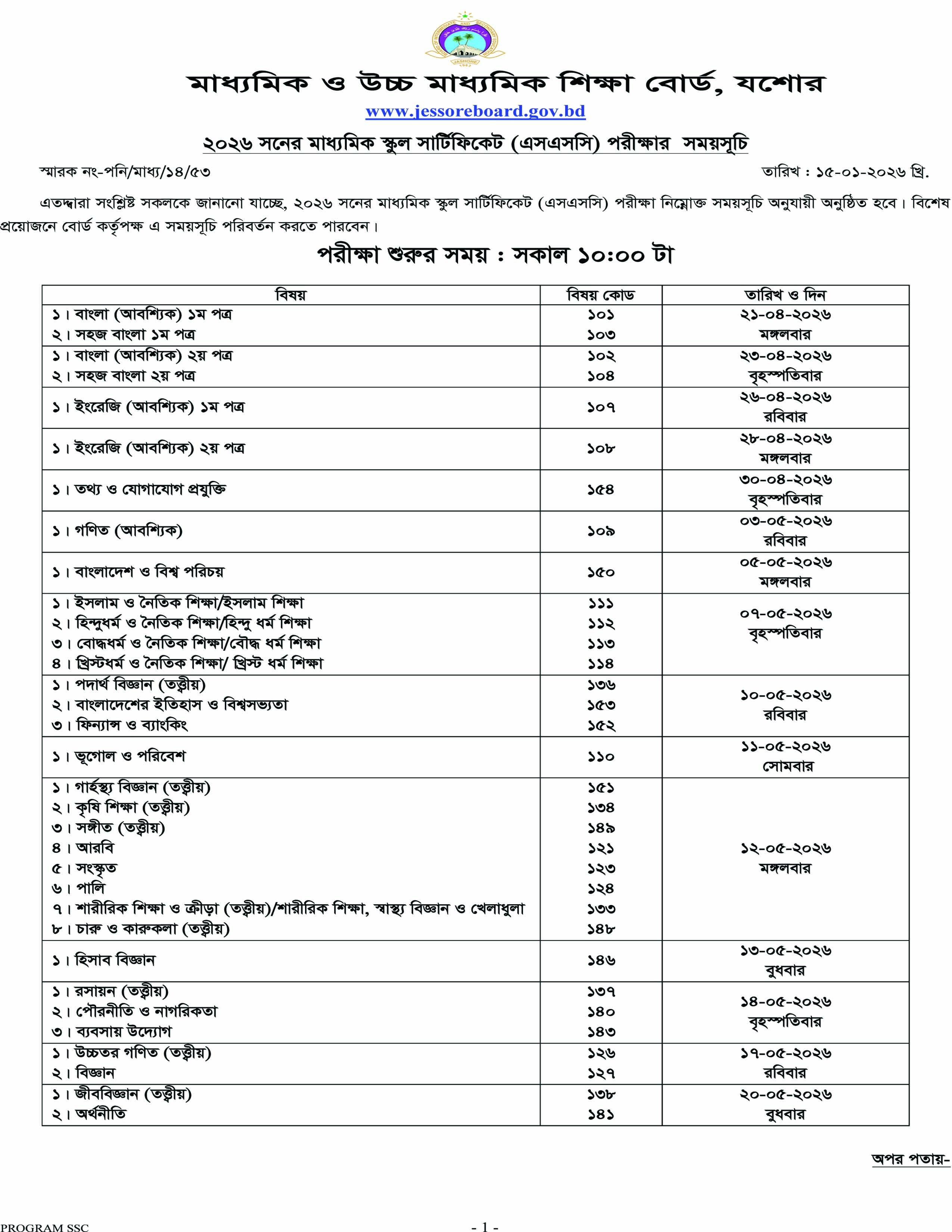 ২০২৬ সালের মাধ্যমিক স্কুল সার্টিফিকেট (এসএসসি) পরীক্ষার সময়সূচি। |