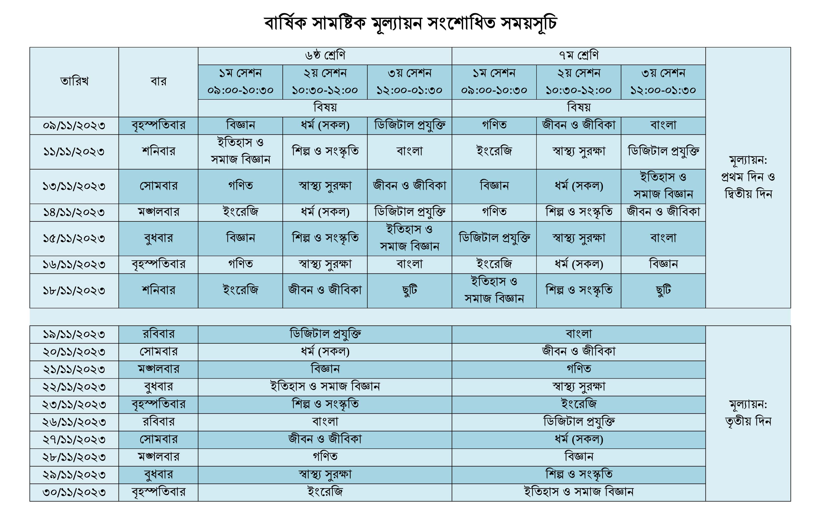 ষষ্ঠ ও সপ্তম শ্রেণির বার্ষিক সামষ্টিক মূল্যায়ন সময়সূচি |
