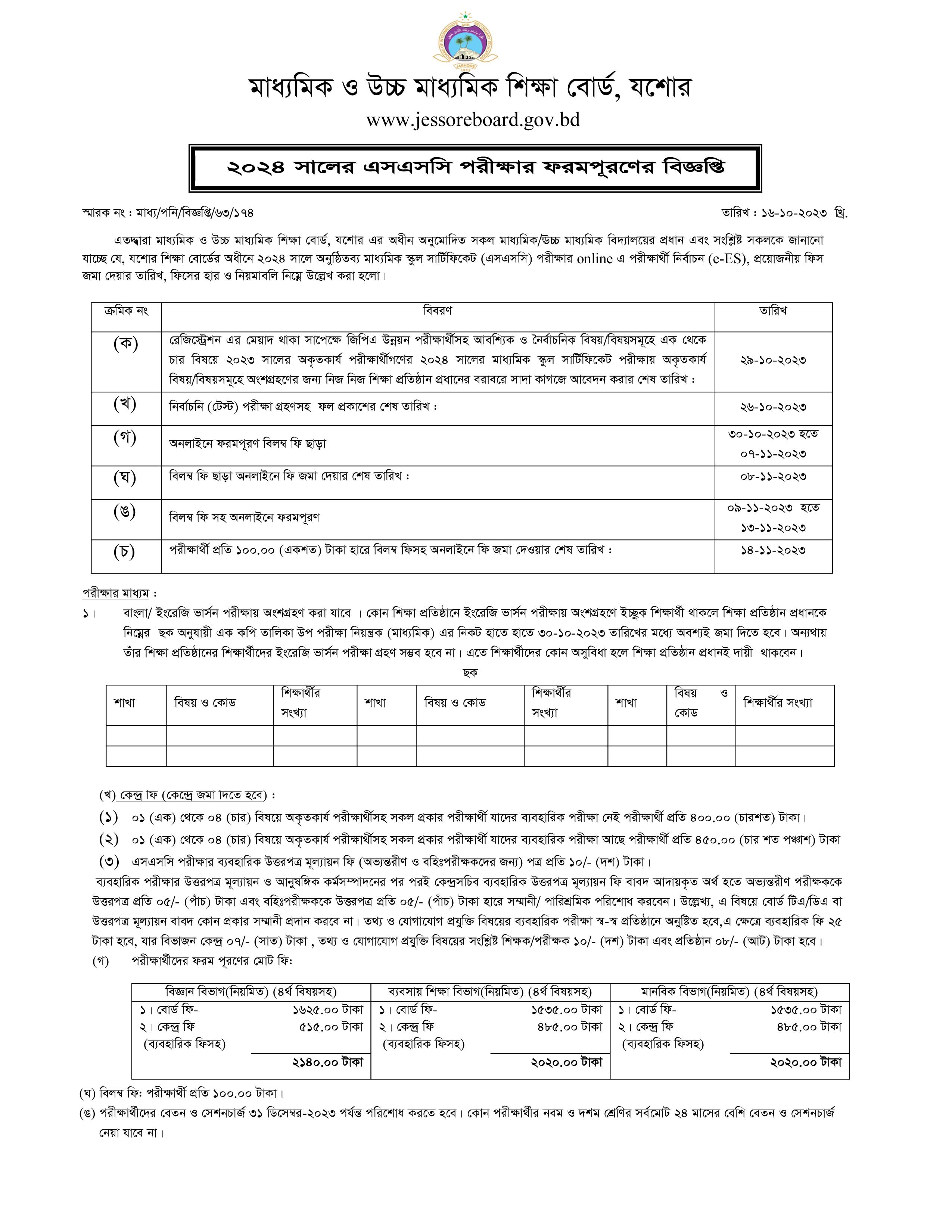 ২০২৪ সালের এসএসসি পরীক্ষার ফরমপূরণের বিজ্ঞপ্তি |