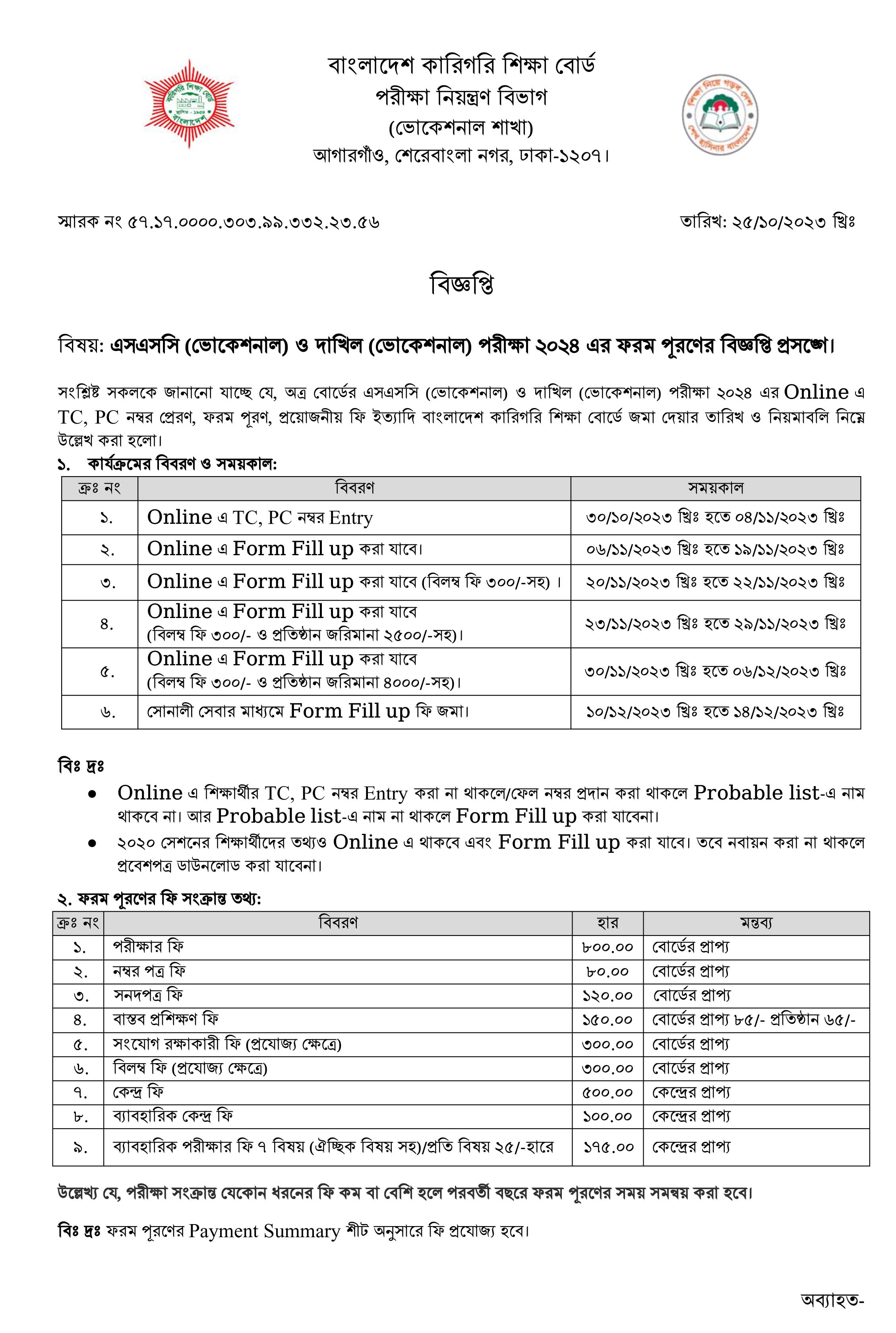 এসএসসি (ভোক) সমাপনী পরীক্ষা ২০২৪ এর ফরম পূরনের বিজ্ঞপ্তি |