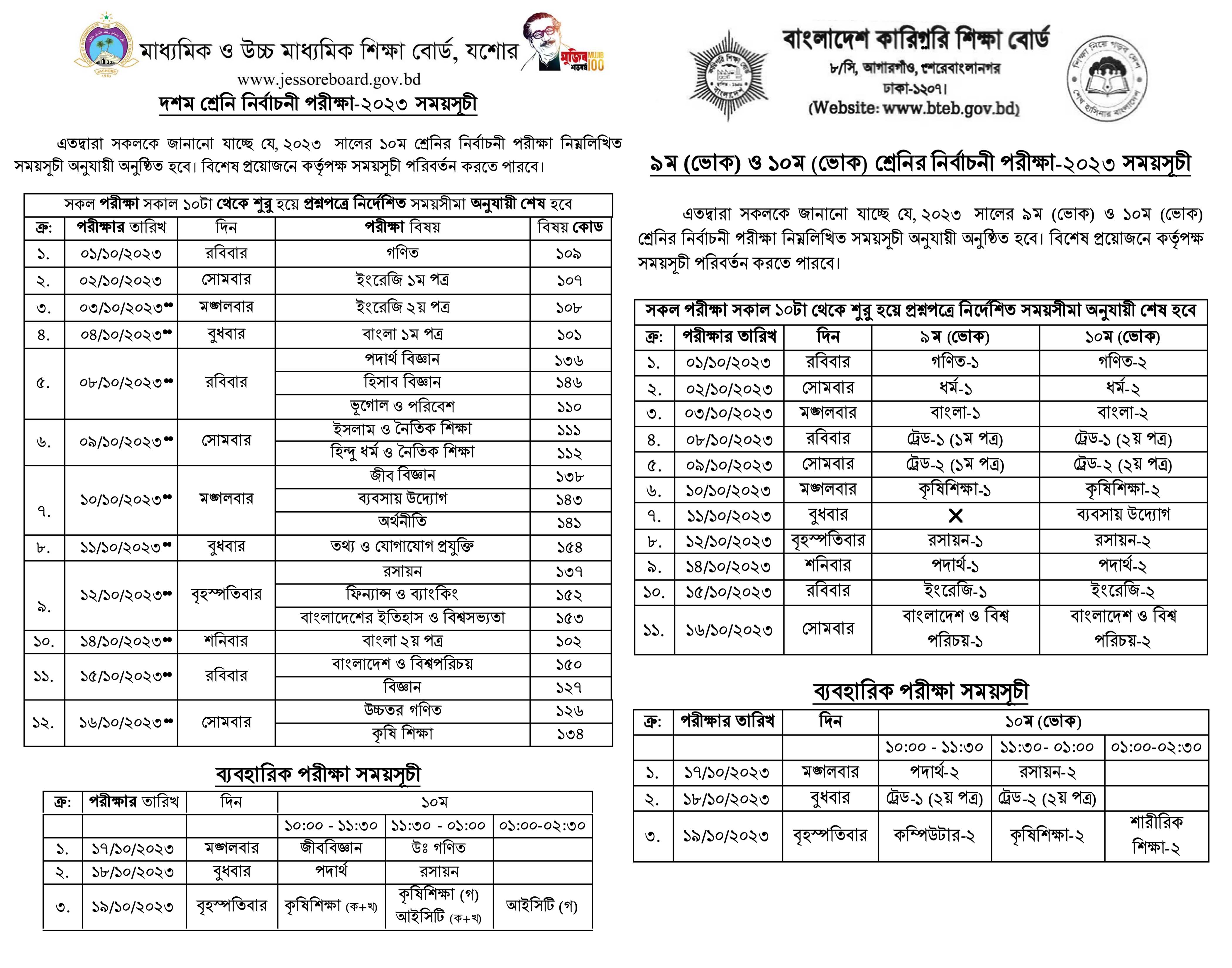 ২০২৩ সালের ১০ম, ১০ম ভোক ও ৯ম ভোক শ্রেণির নির্বাচনি পরীক্ষা পরিবর্তিত সময়সূচি। |