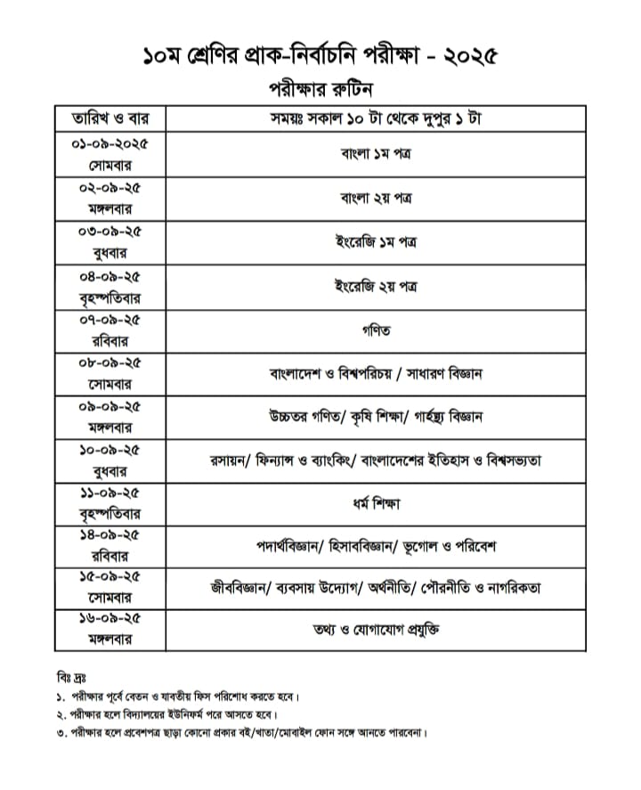 ১০ম শ্রেনির (এসএসসি২০২৬) প্রাক নির্বাচনী পরীক্ষার রুটিন |